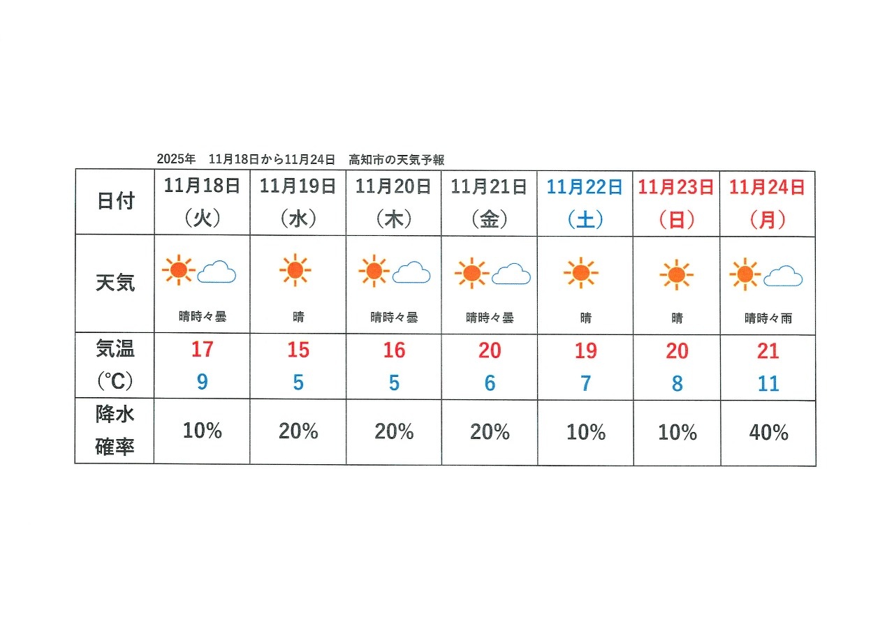 高知市天気予報 11月18日から11月24日