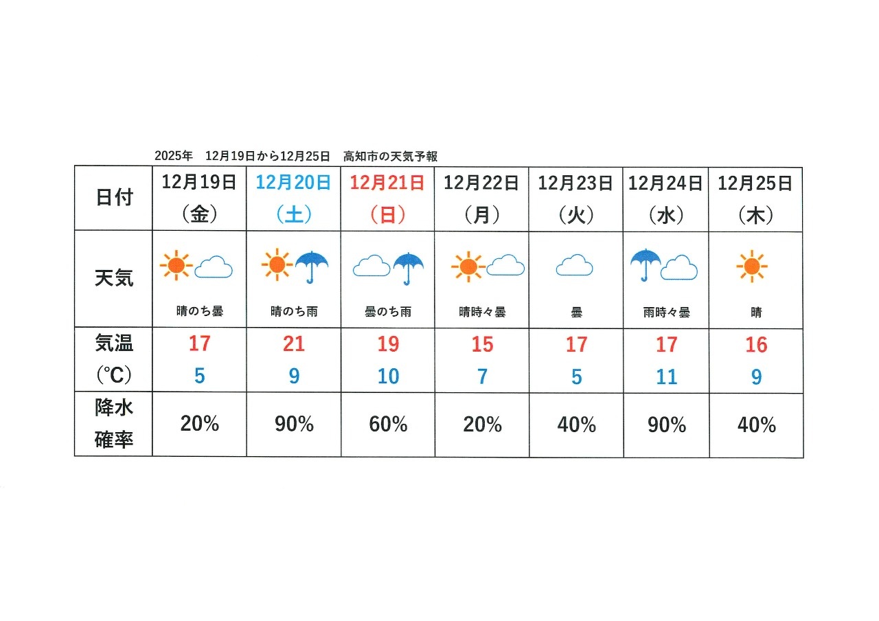 高知市の天気予報12月19日から12月25日ですが
