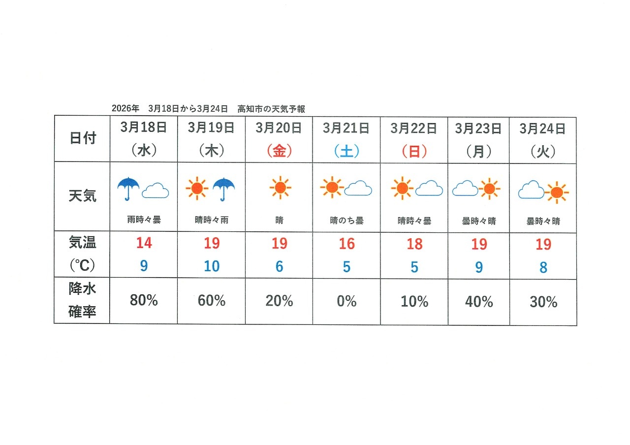 高知市の3月18日~24日までの天気予報