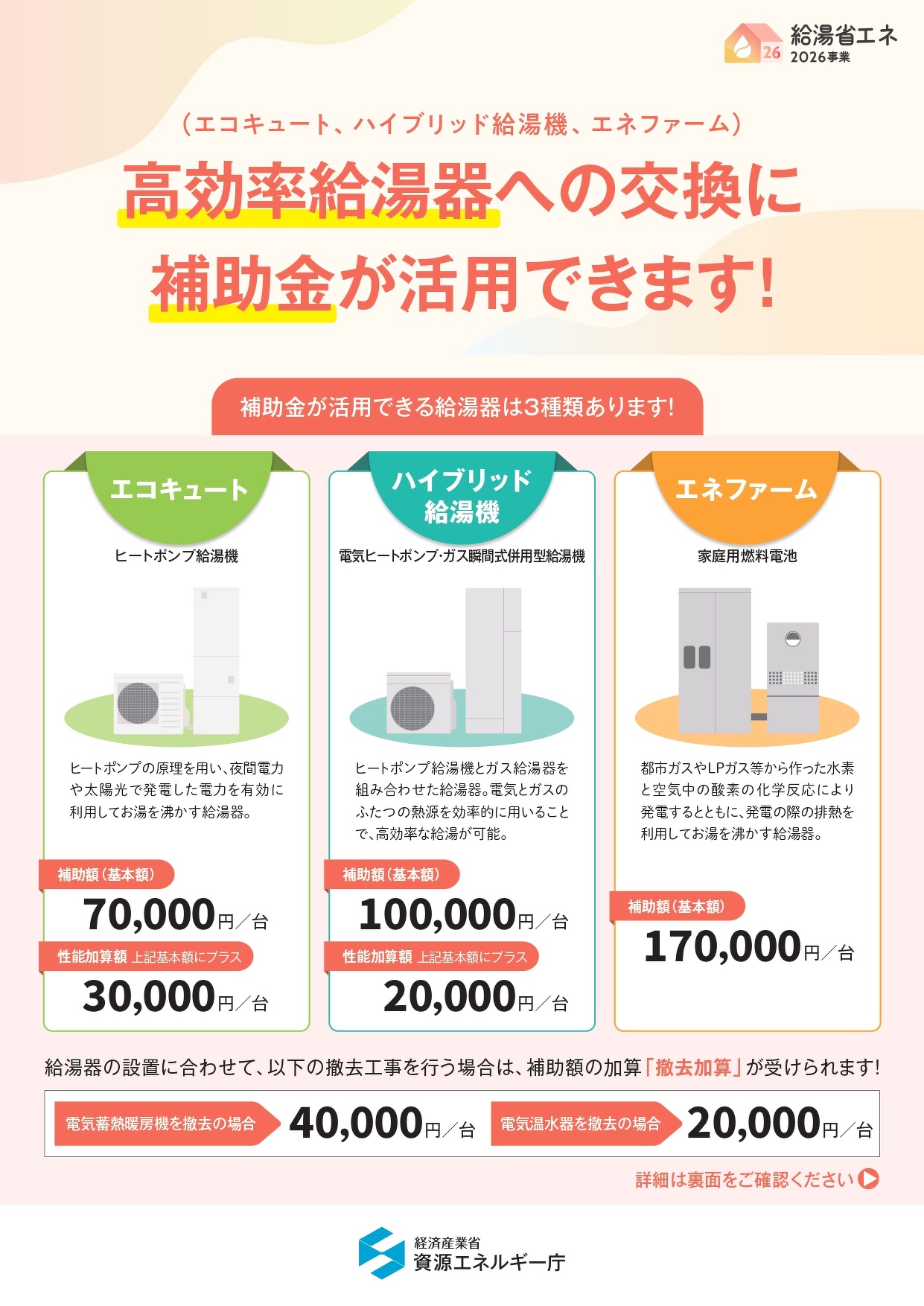 あわせて、 高効率給湯器(エコキュート等)の補助金制度も開始されています。