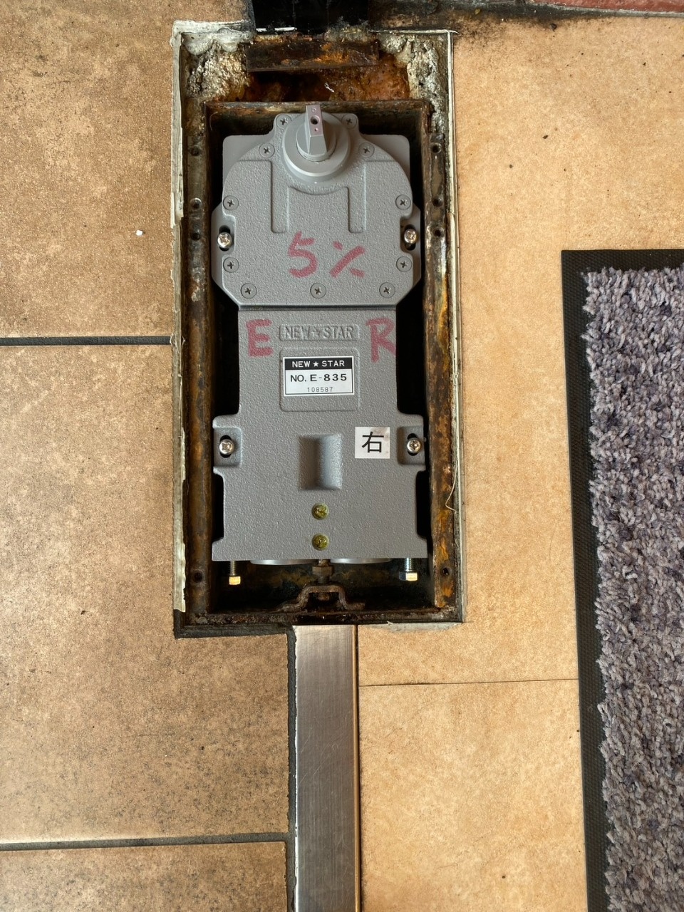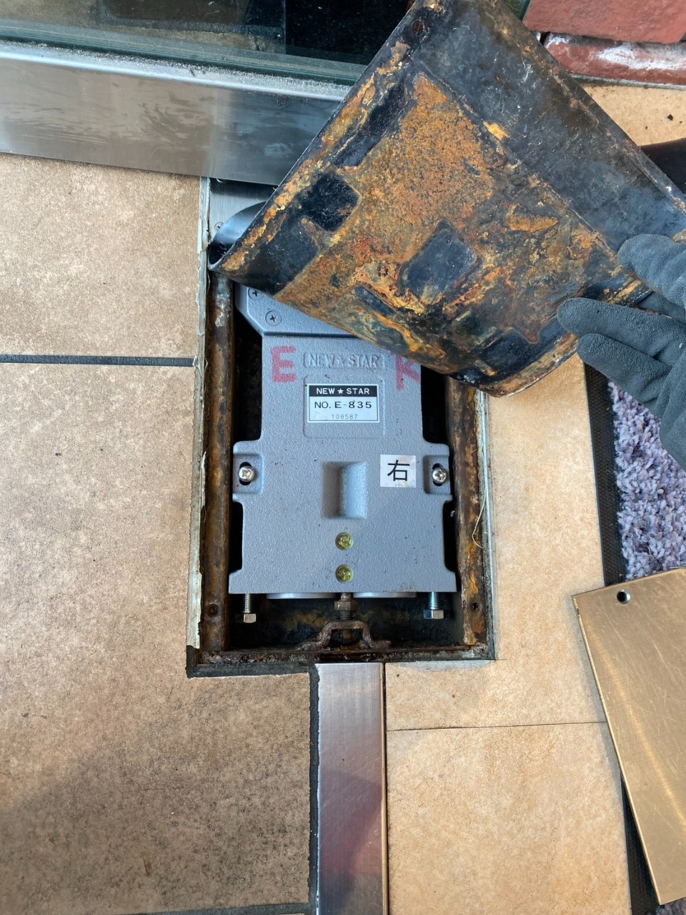 某飲食店【高知市】フロアヒンジ交換工事 今回紹介するのはガラスドアのフロアヒンジ交換工事についてです❕バタンと閉まるようになってしまったとの事で現場調査に行くとフロアヒンジ内に水が溜まっており、錆びついて油漏れして油圧が効かなくなってしまっている状態でした????交換が必要となり、商品が届いたので交換してきました♪ 施工前 撤去中 ヒンジを外して中に入っていた水、油を撤去して拭き掃除をしました❕新しいのを入れます♪ 施工後 新しいヒンジを入れて、ドアを吊り込み、調整をして交換作業は完了となります✨ゆっくり閉まるようになり、お店の方にも喜んで頂きました♪最後まで見て頂き、ありがとうございました❕ 令和8年 3月25日 Y,N