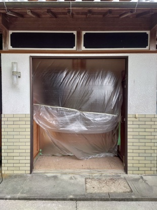 既存枠を撤去するときに機械の刃で家の中に入らないようにしっかり養生します。