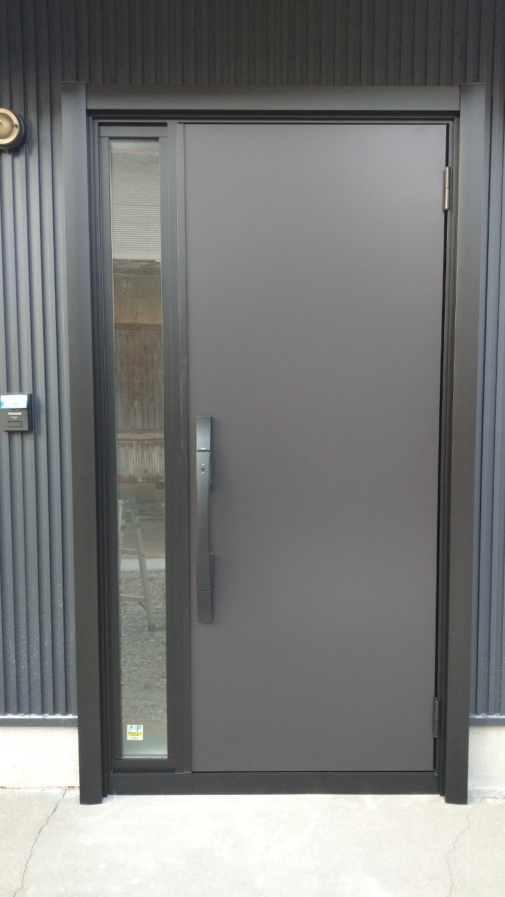 施工前の玄関ドアと比べるとデザインが丸っきり変わりましたが外壁との調和が良く取れている様に思われます。